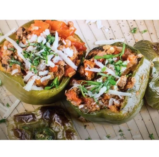 Heat large pan to medium / high add you onion /Jalapeno peppers cook till golden add chopped garlic for a minute add ground meat and cook till fully cooked now add all the others ingredients / salt and pepper to liking and stuff the peppers .. Cook them in a 350 degree oven for about 30 minutes . serve with a light rosa tomato sauce Buon Appetito Mangia